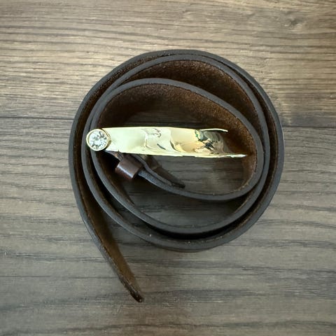Skinnbelte i brun farge, unisex design. Beltet har metallspenne og er laget av skinnmateriale.