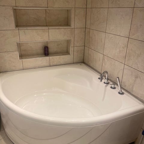 Duvalli boblebadekar i hjørneutførelse, hvit farge. Badekaret har flere massasjedyser plassert i bunnen og langs sidene for vannmassasje. Utstyrt med to nakkestøtter for komfort. Passer til montering i hjørne på baderom.