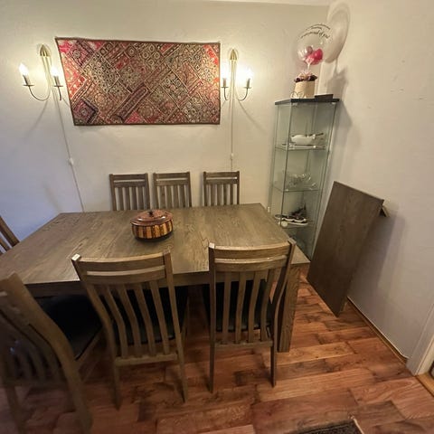 Spisestue m/8 stoler og glass skap