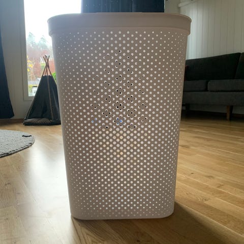 Stor Hvit flettet kurv med håndtak laget av flettet materiale, diameter 50 cm, høyde 40 cm. Rund form med solid bunn og praktisk bærehåndtak. Egnet for oppbevaring ( klesvask, leker oppbevaring og transport av ulike gjenstander.