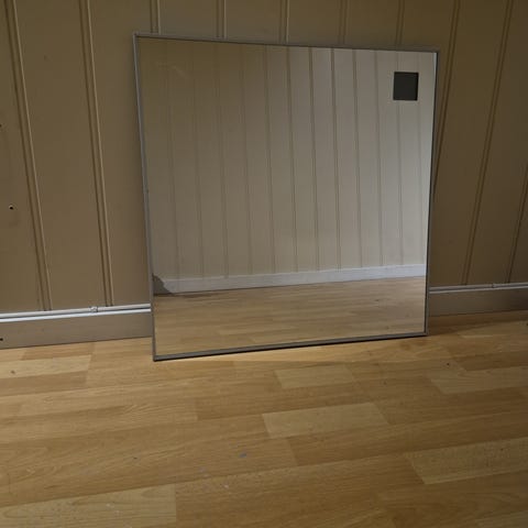 Kan henges opp eller stå på gulvet inntil vegg. Speilet er tungt.