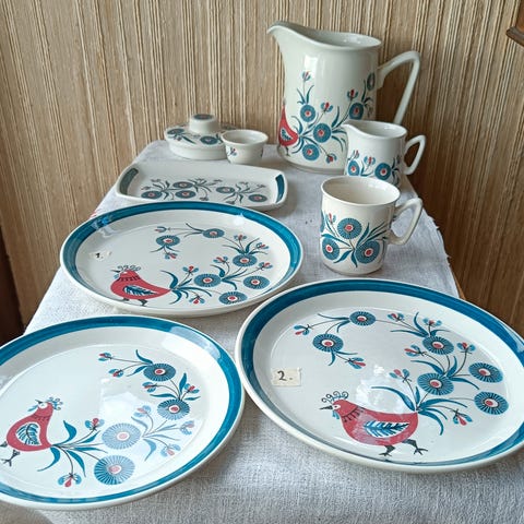 Gammelt Figgjo barne servise😍 Flat tallernken er 20 cm og "dyp" 17 cm tallerken. Dei er like fine👍🤩 Koppen er slitt i fargene. Sjå bilder. Kan sende, pakker super godt inn!! kjøper bet porto kr 69,-