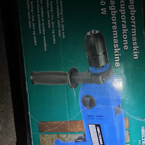 Biltema ID650W slagboremaskin med ekstra håndtak og ledning.