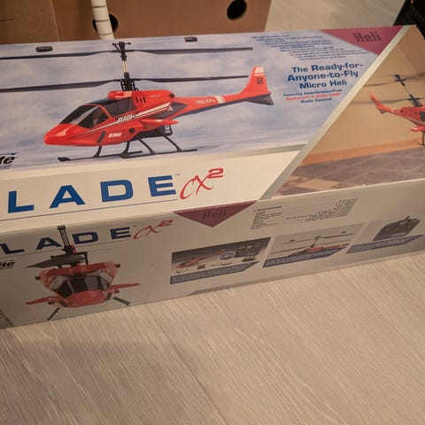 E-Sky Belt-CP V2 radiostyrt helikopter med fjernkontroll. Produktet inkluderer helikopter og kontrollenhet. Fargene på helikopteret er blå, rød og svart. Egnet for bruk som modellhelikopter for hobby og trening.