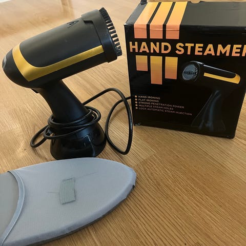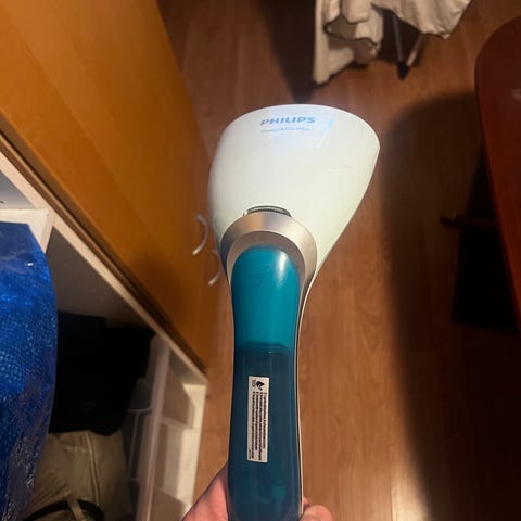 Philips kompakt håndholdt klesdamper i blå og hvit farge. Designet for enkel fjerning av rynker på klær. Utstyrt med ledning for strømtilkobling.