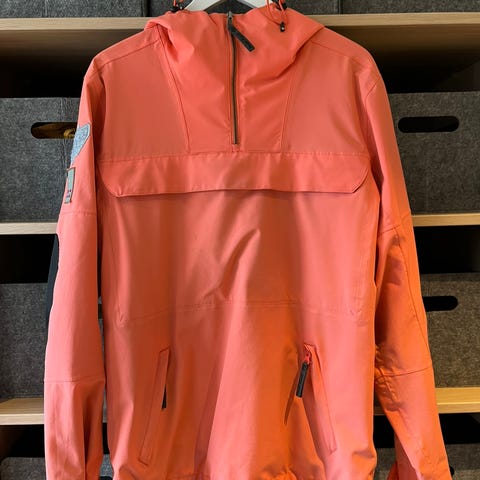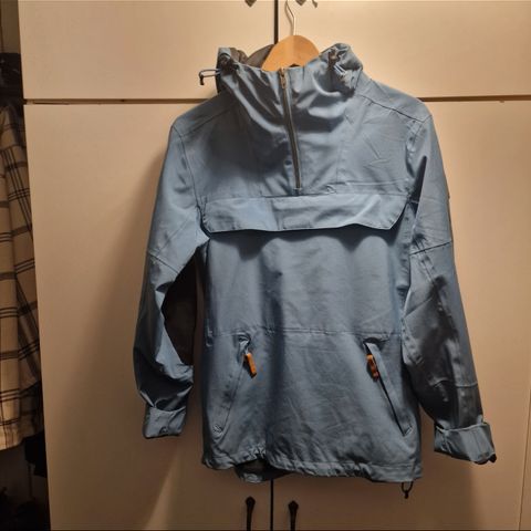 Anorakk fra Daniel Franck i størrelse 36. Jakken er grå og laget av polyester. Den har hette, glidelås i siden og foran. Den er lite brukt men har noen lyse flekker på rygg/bakside arm.