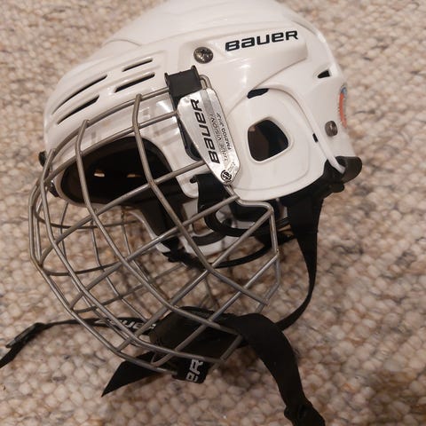 Bauer ishockeyhjelm i blå farge, designet for ishockeybruk. Hjelmen har justerbare stropper og ventilasjon for komfort og sikkerhet under spill.