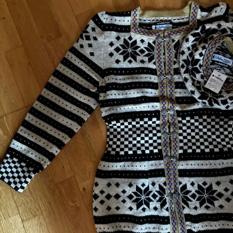 Flott, fargerik og varm ullkofte av Skjæveland strikkefabrikk med tinnhekter. Koften selges da den brukes for sjeldent. Flotte høstfarger! Kan sendes eller hentes på Lysaker :-)