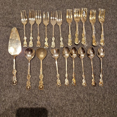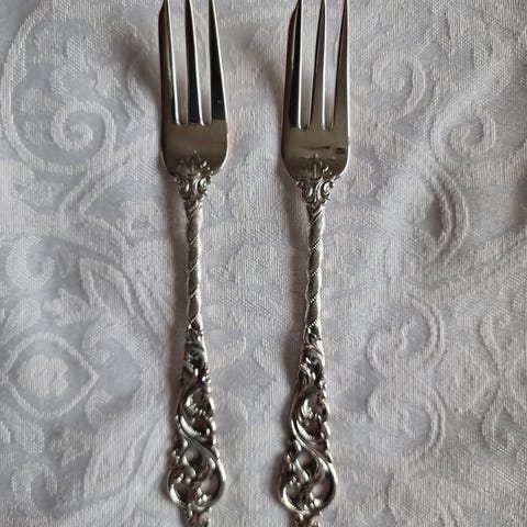 Selger sammen 12 stk kakegafler i veldig pen vintage stand. Gravert med T eller L i gammel stil skrift.