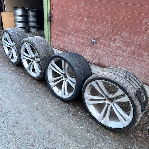 22 toms felger som har blitt brukt på Bmw e 70. Felgene er runde og uten kast,sommerdekkene foran var jeg missfornøyd med,så disse er tilbakelevert forhandler. Disse felgene ser ekstremt bra ut på x5 synes jeg. Ene framfelgen er helt ny.Ble byttet da den ene var litt kantkjørt. Kan medfølge om ønskelig.går ann og reparere den og ha i reserve.