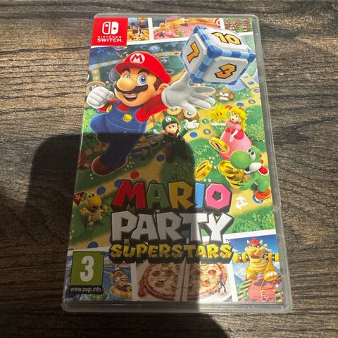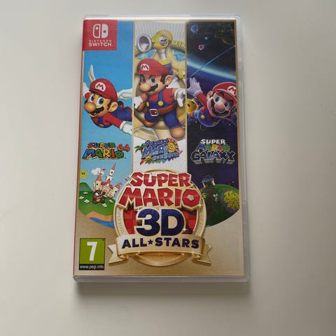 Nintendo Switch Super Mario 3D All-Stars spillpakke med tre klassiske Super Mario-spill: Super Mario 64, Super Mario Sunshine og Super Mario Galaxy. Pakken inkluderer spillene samlet for Nintendo Switch-plattformen.