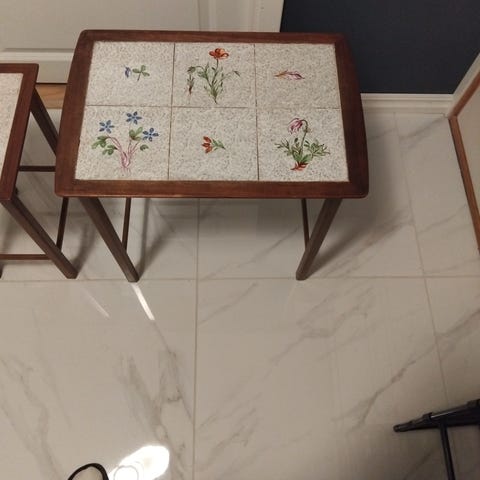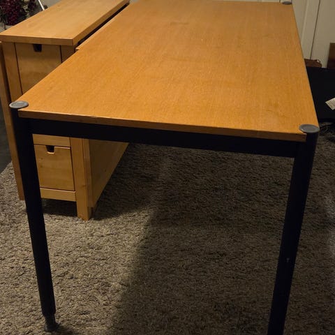 Godt brukt, men pent bord søker et nytt kjærlig hjem. Bordet har flere merker, og hadde nok satt pris på litt pussing og et strøk lakk. Bordet kan utvides med to medfølgende plater som er 41 cm brede hver.