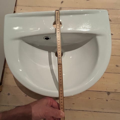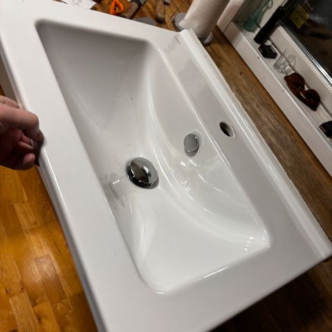 Servant vask med tilhørende armatur. Vasken er kvadratisk med avrundede kanter og har en hvit overflate. Hjørnene har et rosaskjær etter en veldig rød såpe vi hadde.