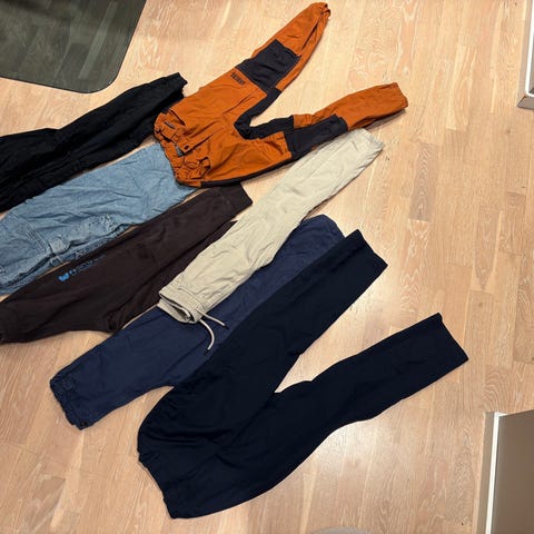 bukser i flerfarget design, størrelse 140, beregnet for gutt. Bukser i ulike farger og materialer, egnet til hverdagsbruk. 1 jeans. 1 grønn joggebukse med matchende genser fra Arket, en mørkegrønn cargobukse med lommer på sidene, en turbukse i brunt og grått fra sport outlet, en jogger pull on i beige og en i svart fra H&M. Selges samlet 300kr.