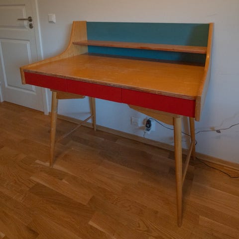 Meget praktisk òg pent skrivebord som kan lett legges sammen. Veier lite og er kun 3cm bredt når lagt sammen