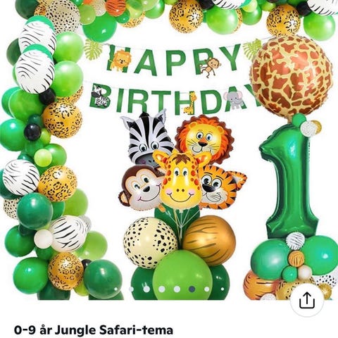 Dekorativt sett med jungeltema, perfekt til barnerom, bursdag eller fest. Settet inneholder flere figurer og blader som kan henges opp med medfølgende snor.