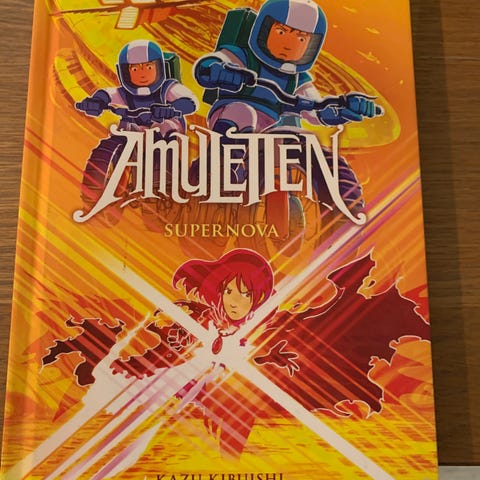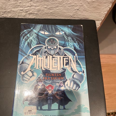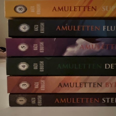 Kazu Kibuishi Amuletten bokserie består av flere bind med fantasy-tema. Serien inkluderer titler som 'Ildfuglen', 'Det hemmelige rådet', 'Byen bak skyene' og 'Steinvokterens forbannelse'. Bøkene har illustrasjoner og er rettet mot lesere som er interessert i grafiske romaner og fantasyfortellinger.