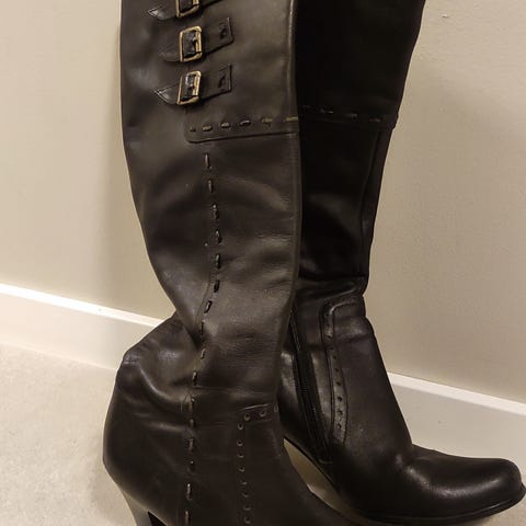 Selger et par ubrukte støvletter i str 40. Brede i skaftet og høye, solide hæler. Svart. Ny pris ca 800