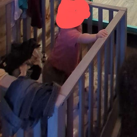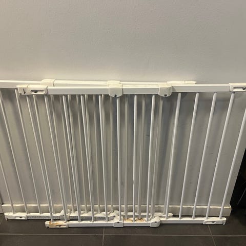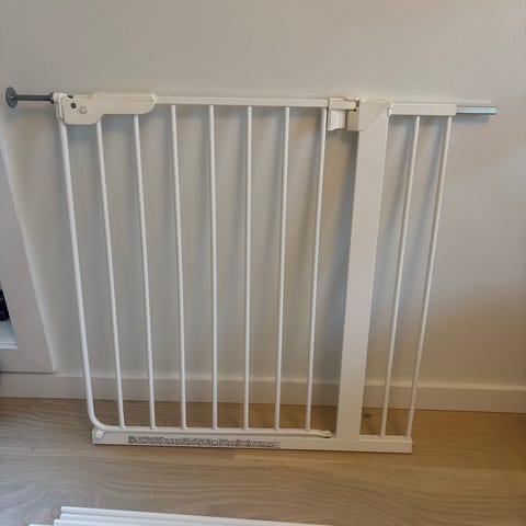 Lekegrind fra BabyDan, med en tjukk, behagelig lekematte. Grinda er litt vanskelig å sette sammen, og vi har brukt en stropp for å holde den sammen (se bilde).