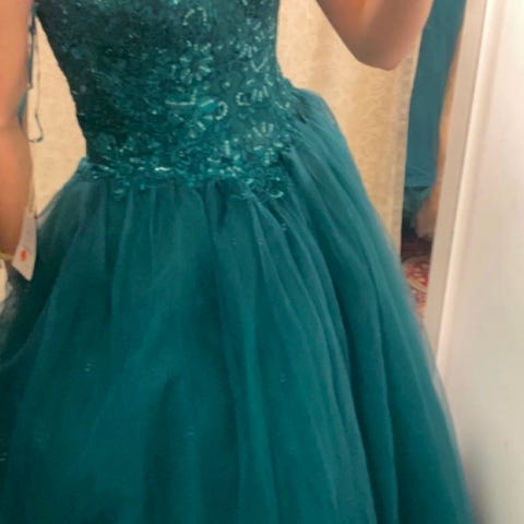 Kjole fra Kris of Norway str 30, passer XS’-liten medium pga snøring i ryggen. Kjøpt i salong , Fru Tjernsli Råholt. Underskjørt kan følge med. Noen merker på blondene under armer pga selvbruning, men ubetydelig og synes ikke når kjolen er på.😊