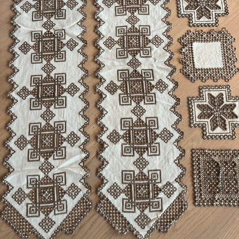 Ubrukt kappelaken med blonder og silkebånd i offwhite/bommullsfarge..helt glemt ut i skapet..passer til 180 seng...nydelig når det er strøkent....gi gjerne bud..betalte ca 1400 kr nytt et par år tilbake.