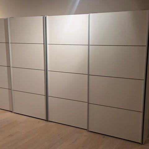 Selges solid garderobeskap med skyvedører. Én del med speil, den andre uten speil.