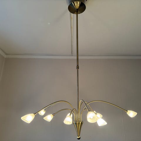 Er et blikkfang i rommet og kan dimmes helt ned i varm, kald eller naturlig lys. Fjernkontroll følger også med. Ser veldig eksklusiv ut.
