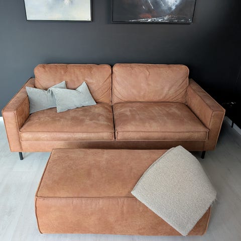 Grå lenestoler med puff selges.