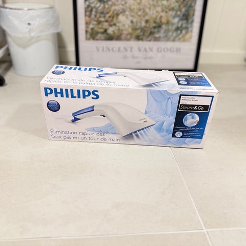 Philips håndholdt tekstilsteamer i hvit og blå farge. Designet for enkel bruk til steaming av klær og tekstiler. Utstyrt med børste rundt steamhodet for bedre resultat.