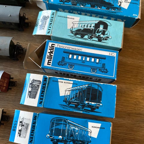 Sett med skinner til modelljernbane bestående av rette og buede seksjoner. Inkluderer også sporveksler med elektriske tilkoblinger. Noen lasker er litt slitne. Pensene fungerer som de skal
