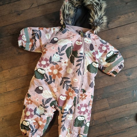 Lite brukt vinterdress. Ingen flekker, merker eller slitasje. Vanntett med fleecefor og avtagbar hette og pels. Mørkeblå med hvite prikker.