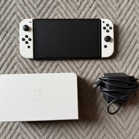 Selger Nintendo Switch OLED hvit, 64GB. Meget pent brukt, ingen synlige riper eller skader.