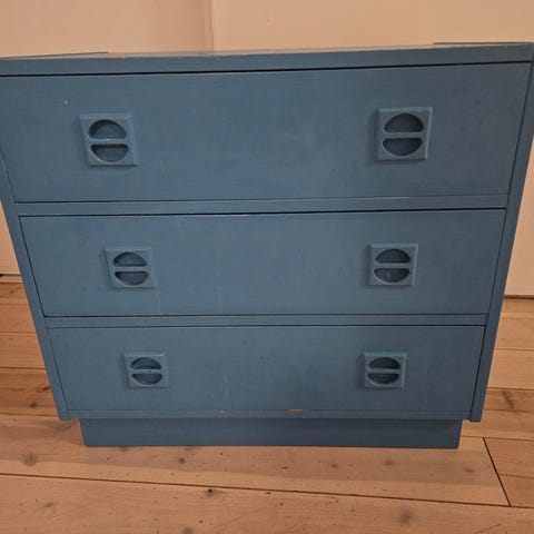 Kommoden er svart med 5 skuffer. Den har noen skraper på topp-platen ellers fungerer skuffene helt fint.