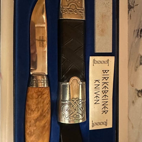 Solgt gjennom Evangeliesenteret. Alle beslag på slire og holker på knivskaftet er laget i sølv, stemplet 925 s. Ligger i fin original eske med bilder og tekst. Da denne kniven ikke lages lenger vil denne kunne stige i verdi. Dette er en fin kniv og ha i belte eller i kniv samlingen. Kniven har aldri vært brukt. Like fin. Se godt på bildene.