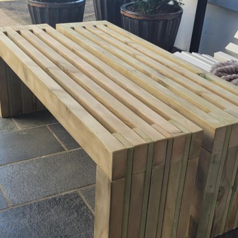 Hvit hagebenk laget av tre. Benken har en enkel design med horisontale treplanker og er egnet for utendørs bruk. Passer for plassering i hjørner for å utnytte plass effektivt.