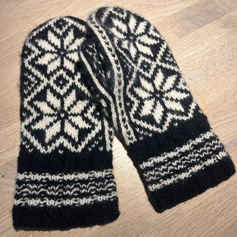 Selbu votter i stor størrelse for herre. Flerfarget mønster med tradisjonelt design. Strikket i ullgarn som gir varme og isolasjon, fargen er brun og hvit.