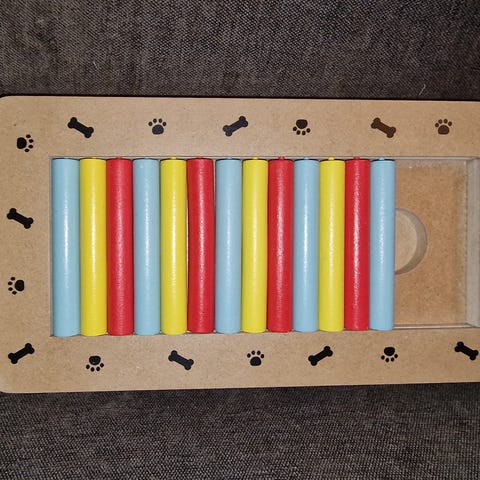 Gjem godbitene i den og hunden må skyve vekk det som stopper for å få tak i godbitene. Kjøpt hos veterinær.