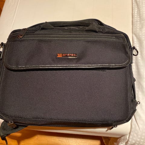 Kassa har noen bruksmerker, men mange gode år igjen. Det er hardkasse som er fin å reise med, med plass til stort instrument, noter og notestativ .