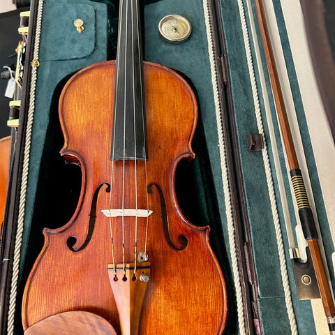 Fiolin med medfølgende bue og hardcase. Fiolinen har en tradisjonell utforming med treverk i naturlig farge. Hardcase har grønt interiør og er designet for å beskytte fiolinen under transport og oppbevaring.