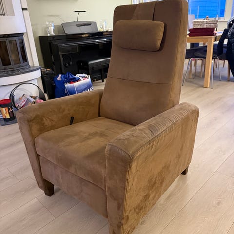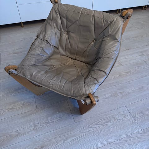 Selger Hjellegjerde stol med fotskammel. Stolen er grå med stålbein og med sving. Røykfri. Må hentes