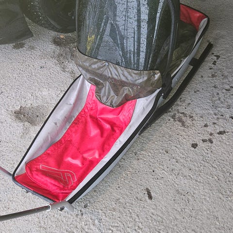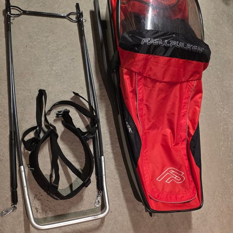 Brukt Fjellpulken, barnepulk. Komplett med belte og drag. Noen flekker og noen riper i vindskjermen.