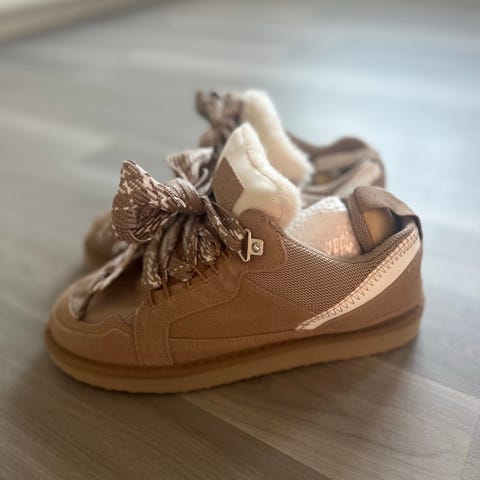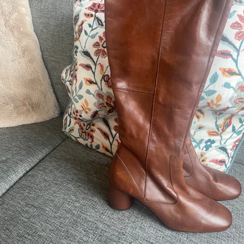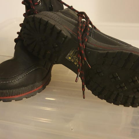 Pent brukte støvletter, uten synlige slitasjemerker, selges.