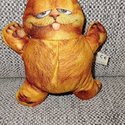 Garfield kosedyr sett bestående av tre figurer i ulike antrekk og positurer. Materialet er myk plysj i oransje og gule toner. En av figurene har regnjakke, en annen har pysjamas og en tredje er liggende. Passer som samleobjekt eller leke.