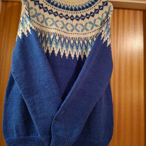 Selger pent/lite brukt hvit/blå Mariusgenser i ull. Antatt str. 8-10 år. Se mål på bildene.