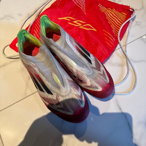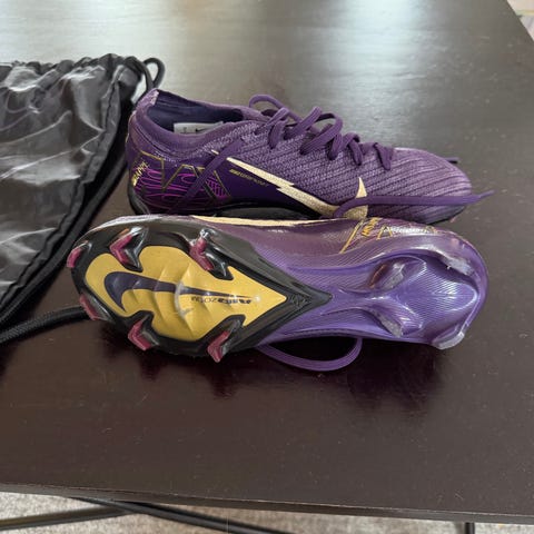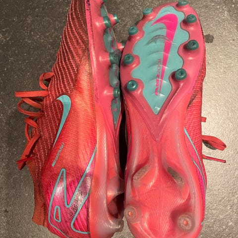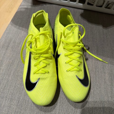 Nike Mercurial fotballsko i størrelse 44 med hvit og gul farge. Skoene har knotter for god grep på banen og er laget for fotballspillere.