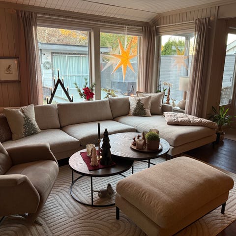 Puff og nakkestøtte er inkludert – disse ble kjøpt i tillegg og matcher sofaen perfekt.