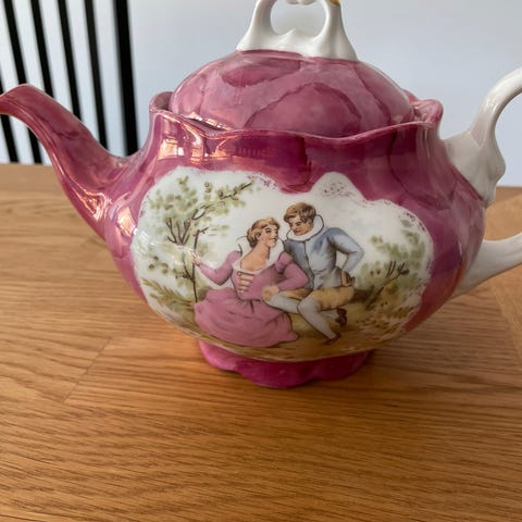 Kannen har et klassisk, riflet design prydet med et dekorativt motiv av vinranker, blader og druer i duse farger. Den har elegante detaljer med gullkant på tut, hank, lokk og åpning. Dette er flott vintage-porselen som tar seg godt ut på kaffebordet eller i vitrineskapet.
