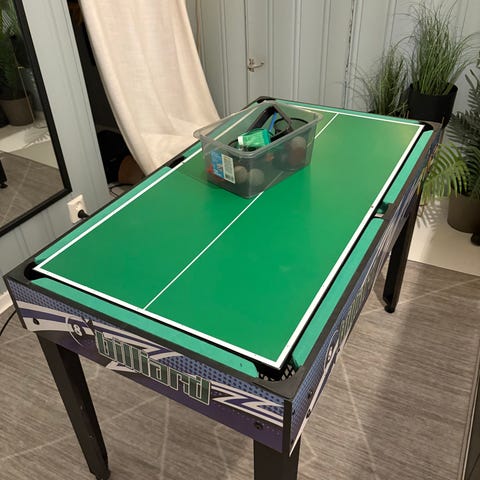 Morsomt spillbord med fire spill i ett. Følger med fire ulike flater som enkelt lar deg skifte mellom fussball, airhockey, bordtennis og biljard. Alt av tilbehør medfølger.