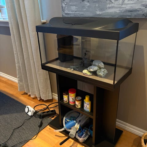 Akvarium er ny bare brukt en måned , huset pumpe ,termometer , hus, filter inkludert. Og steiner