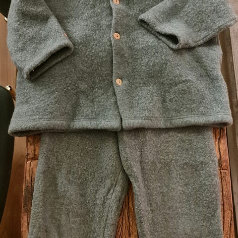 Ullstrikket jakke og nøstebarn ullskjørt